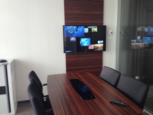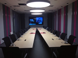 - Wyposażenie sal konferencyjnych w sprzęt multimedialny oraz system nagłaśniający, zintegrowane zdalne sterowanie przez aplikację mobilną (iPhone/iPad/Android): m. in. wybór aktywnego źródła HDMI i sterowanie głośnością.